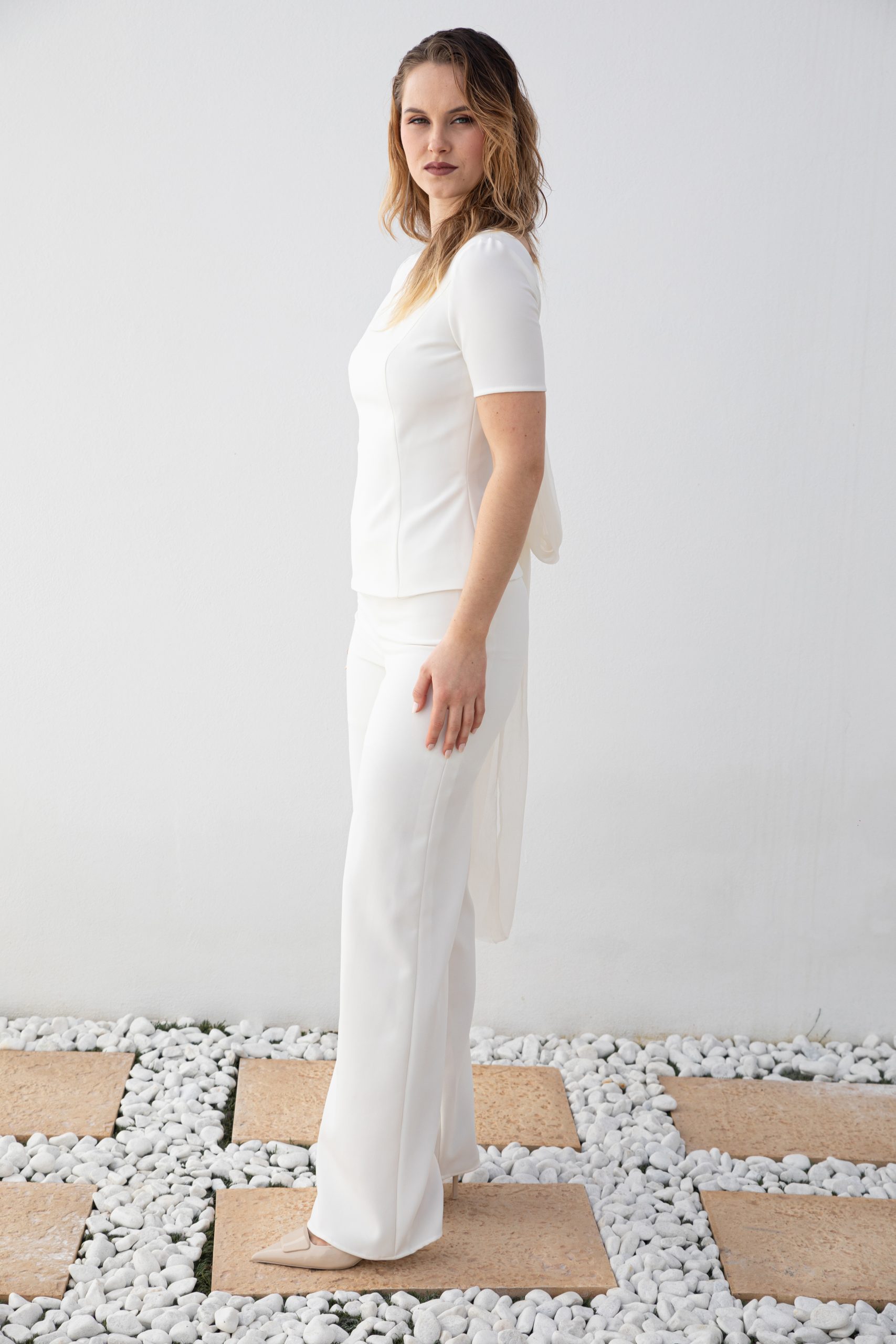 Este pantalón recto, confeccionado en un crepé de seda suave y con un ligero toque de elasticidad, se ajusta al cuerpo con una caída impecable, logrando ese efecto «segunda piel» que estiliza sin renunciar a la comodidad.