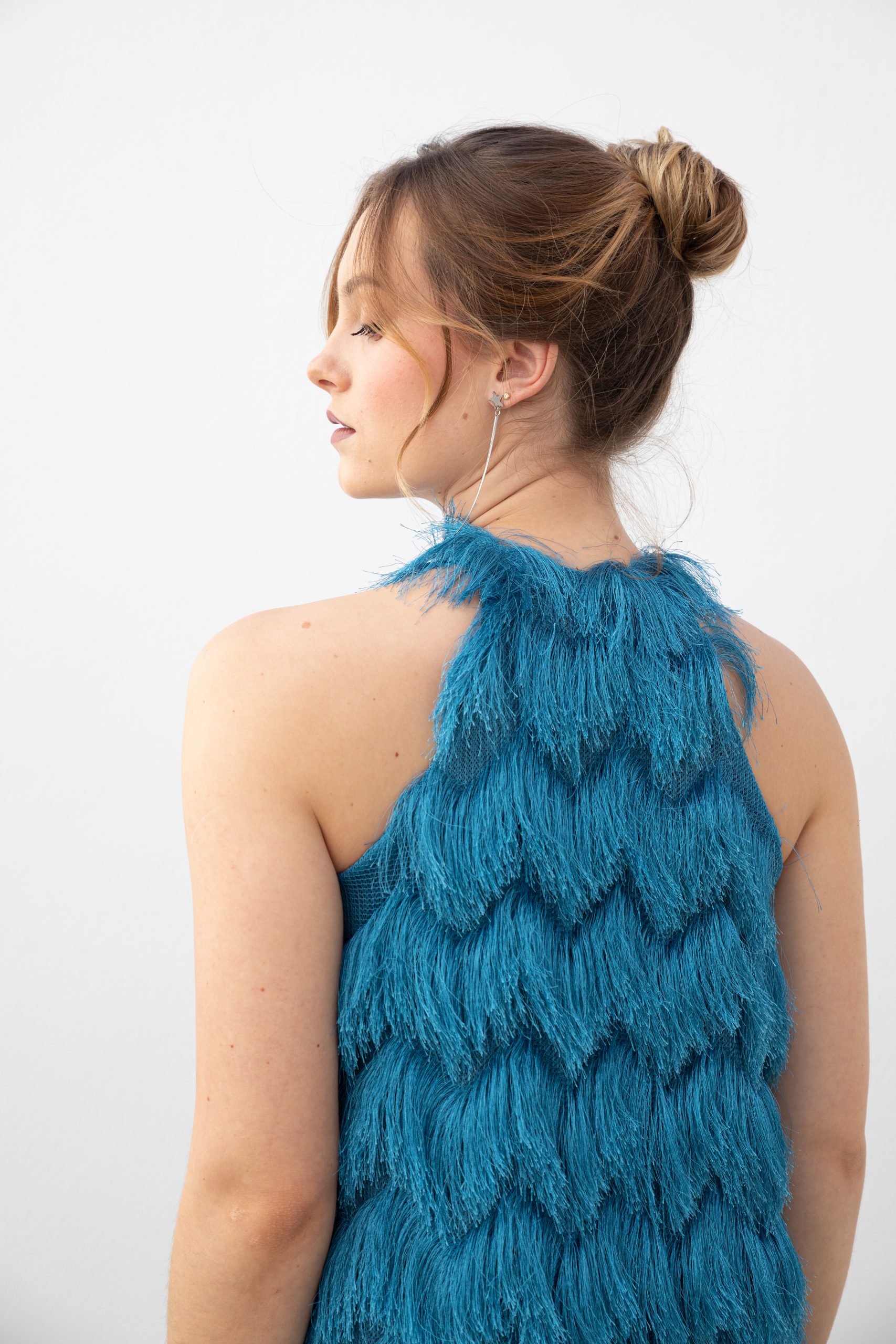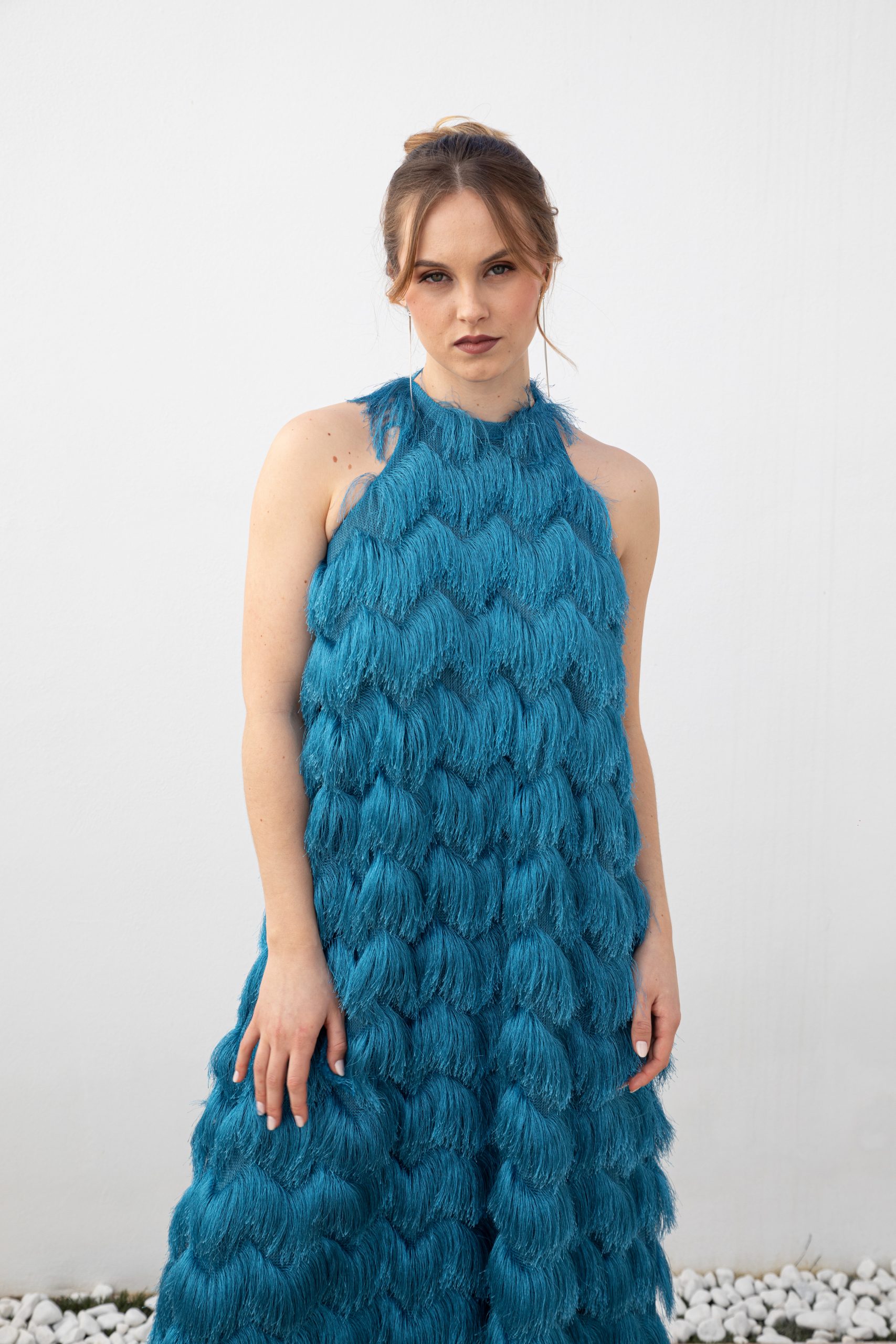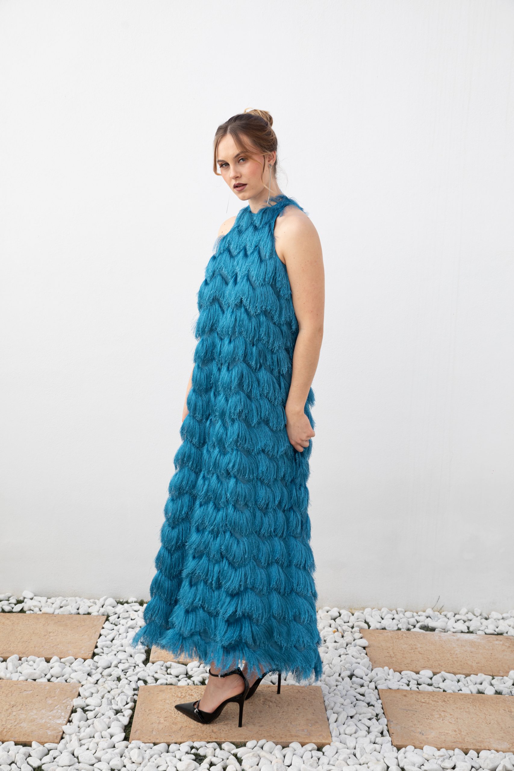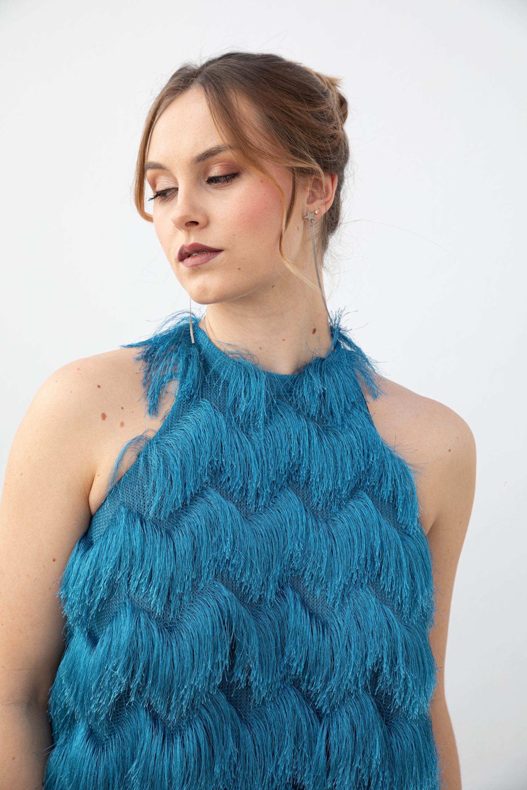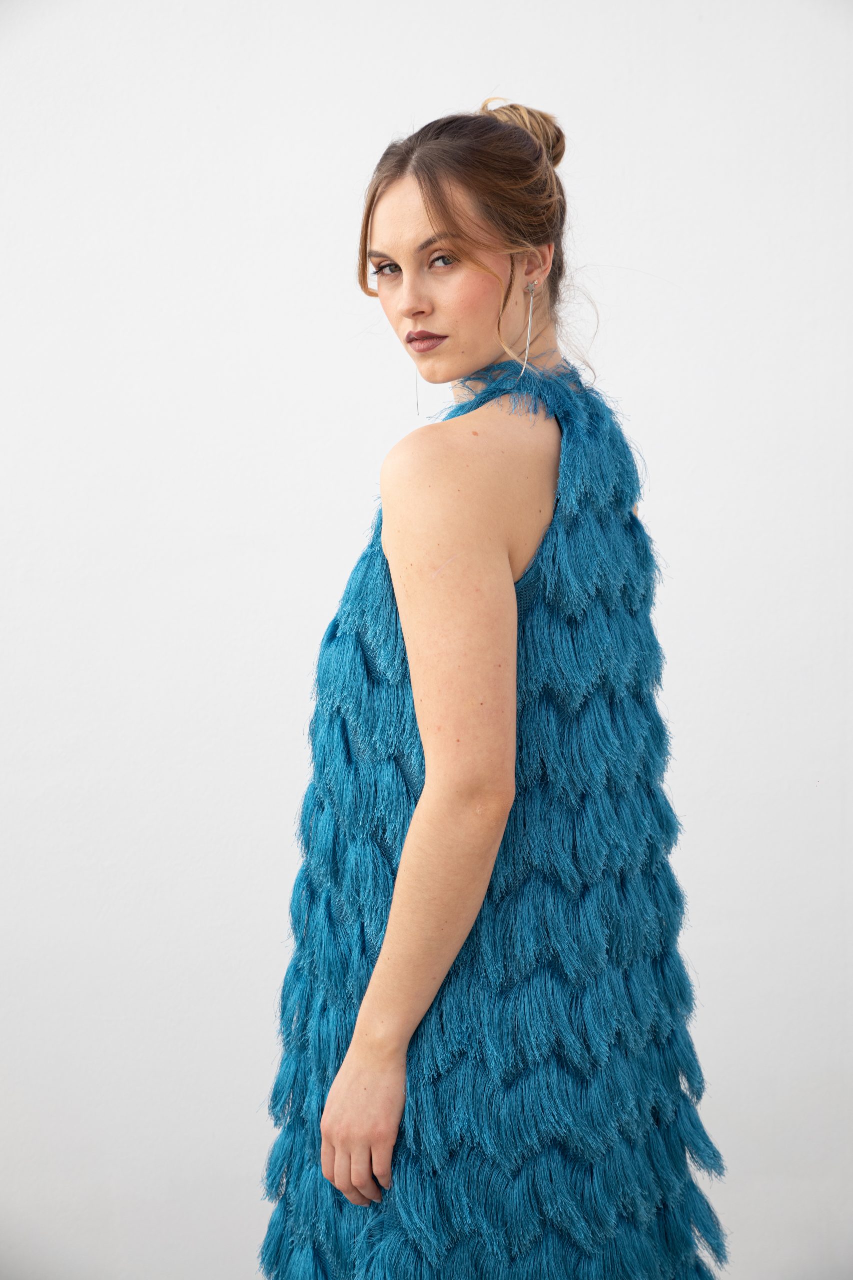 Este vestido con escote halter es una pieza única, confeccionada en un tejido especial de flecos hilados que aportan un movimiento espectacular. Cada paso que des será una auténtica maravilla, con la fluidez y el dinamismo que solo este material puede ofrecer.